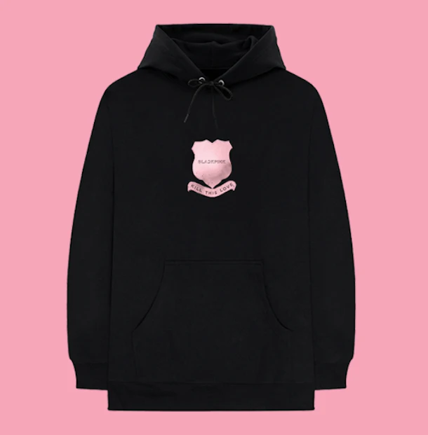 The hoodie itself is black and features a sewn-in patch on the front and printed Kill This Love artwork on the back. The patch and artwork are both pink, so it’s totally on brand for BLACKPINK. Here’s what it looks like: